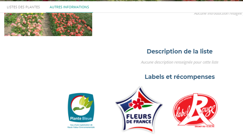 Des logos Plante Bleue, Label Rouge et Fleurs de France ont ainsi fleuri sur l’onglet « autres informations » des catalogues de nos producteurs partenaires mettant en avant leurs démarches.